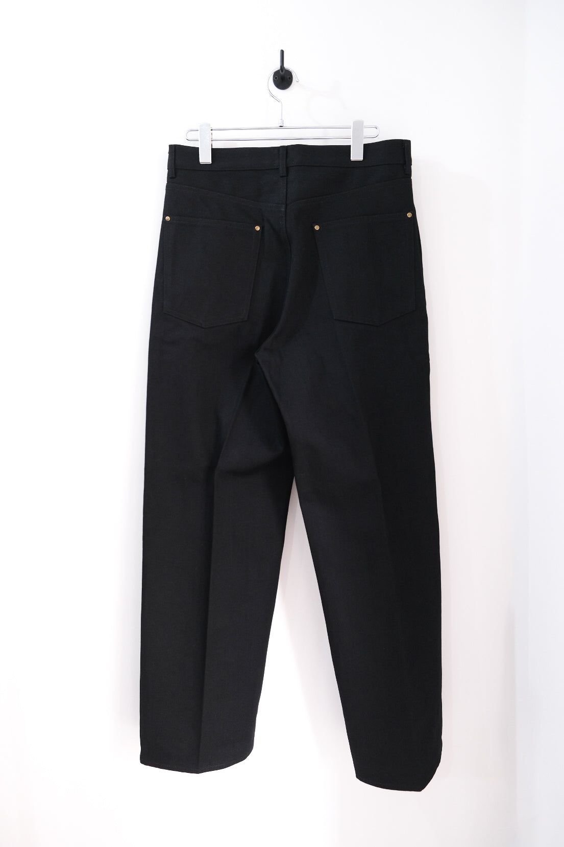 オーソドックスな5ポケットのデニムはややウエストを大きくし股上を浅く、腰で履く設定にしている。