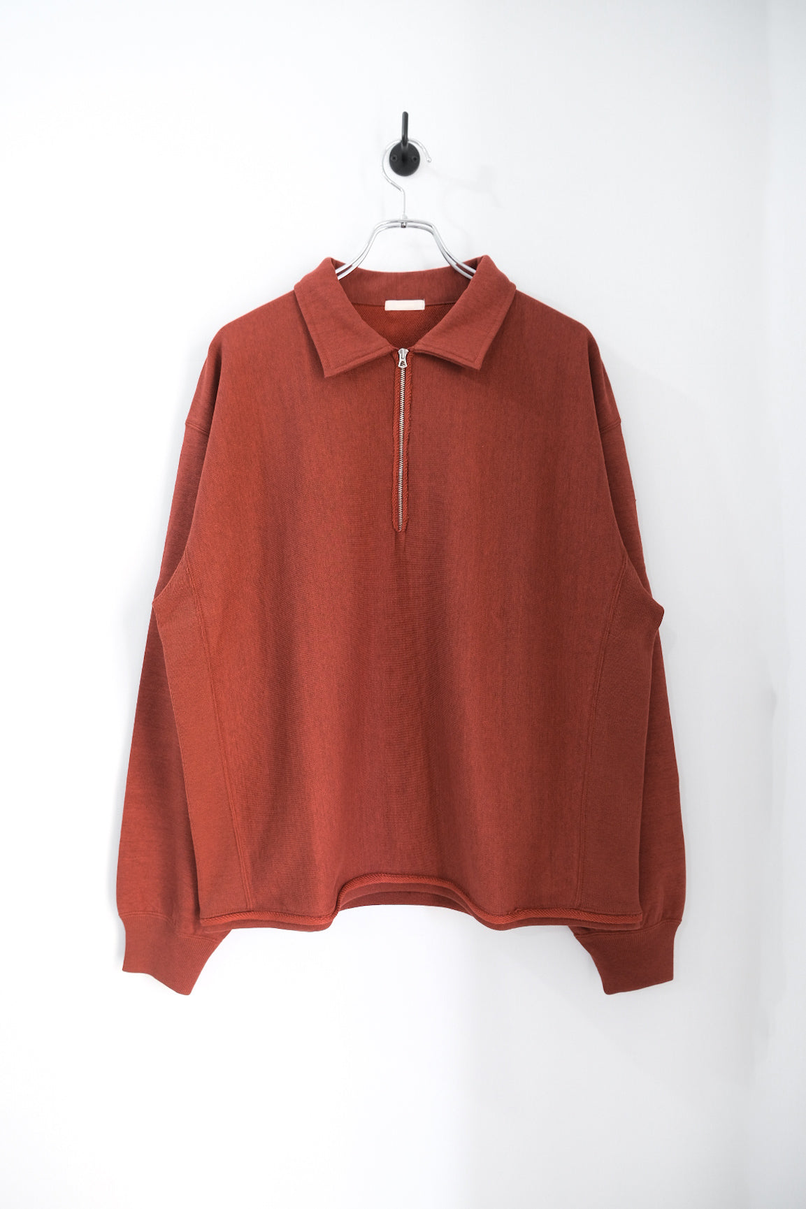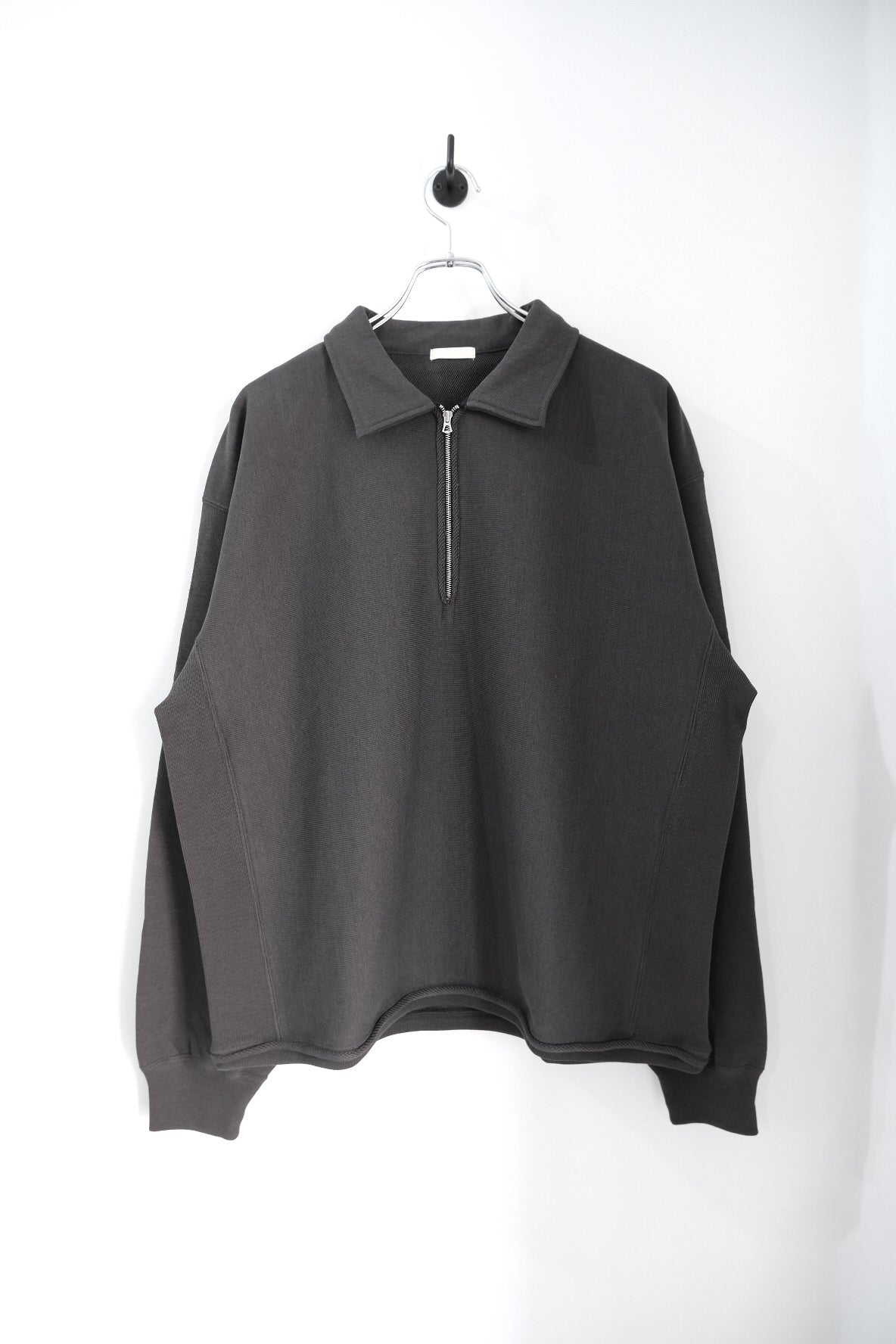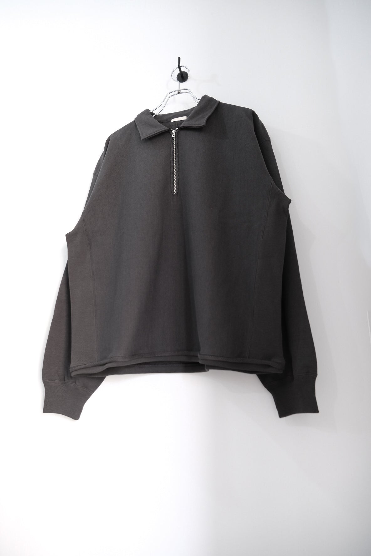 ⾸元や裾リブがカットされていたビンテージのスウェットシャツから着想した断ち切り⾵の仕様と、前後で違いのある変則的な袖付けが特徴的なハーフジッププルオーバー。