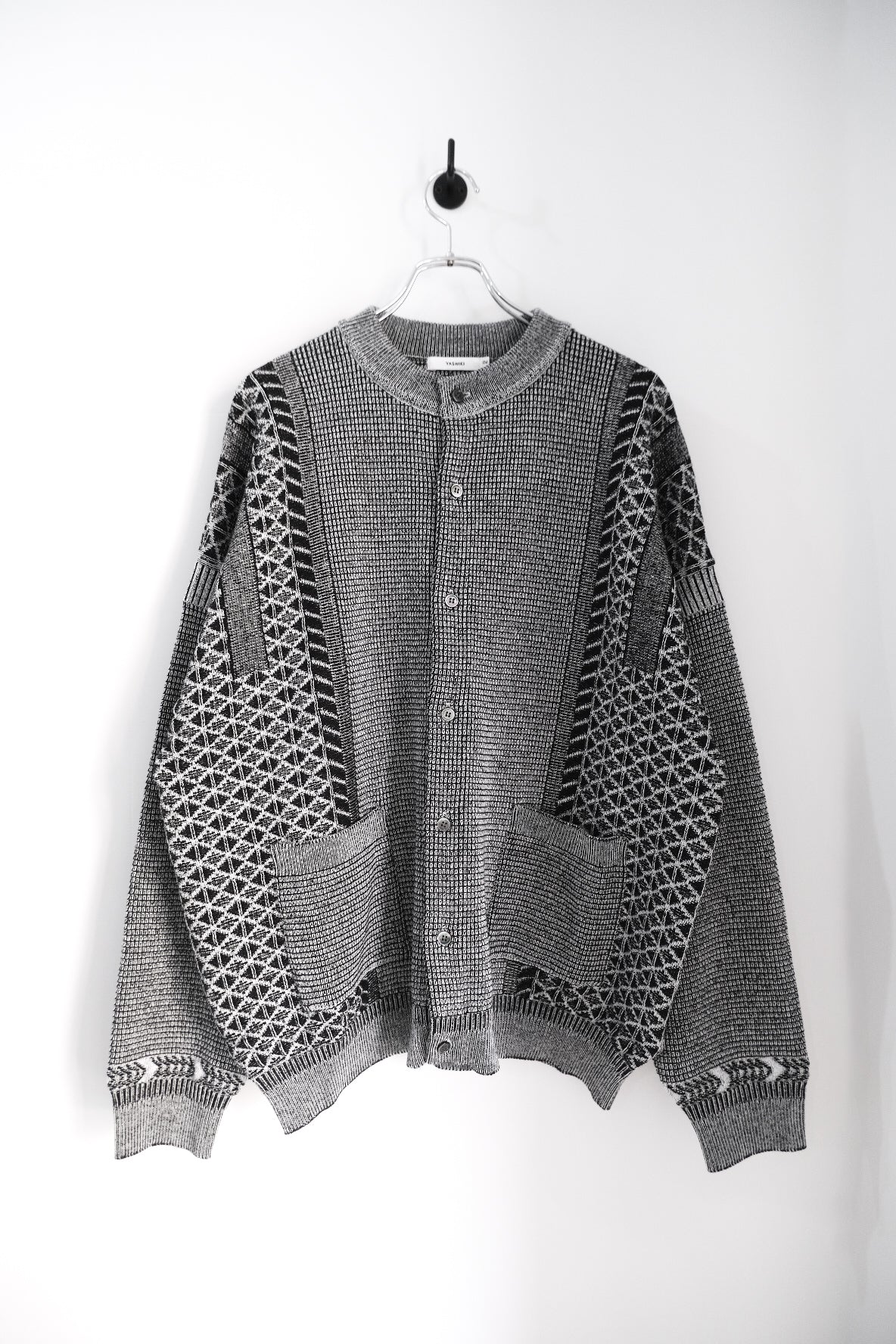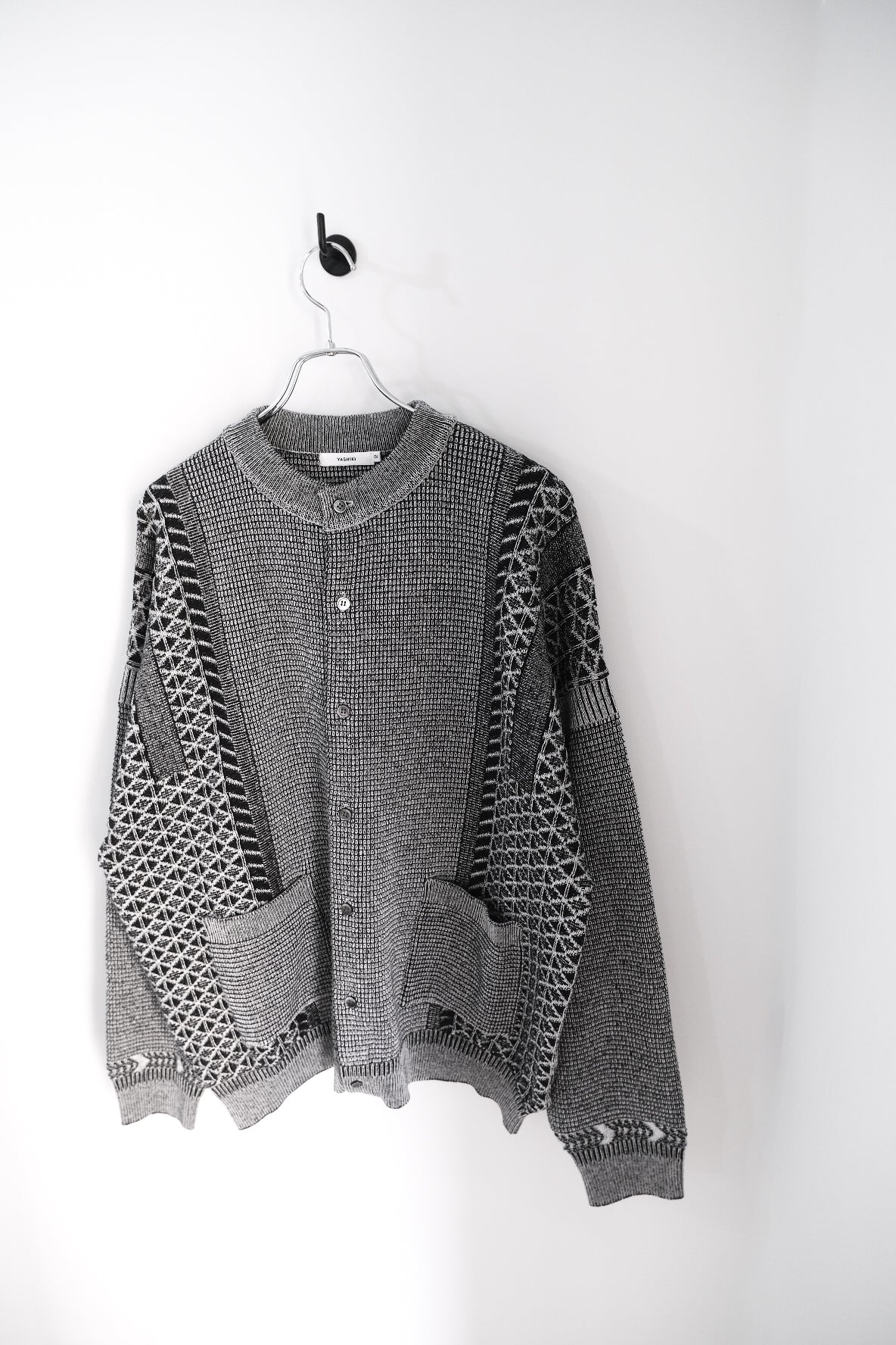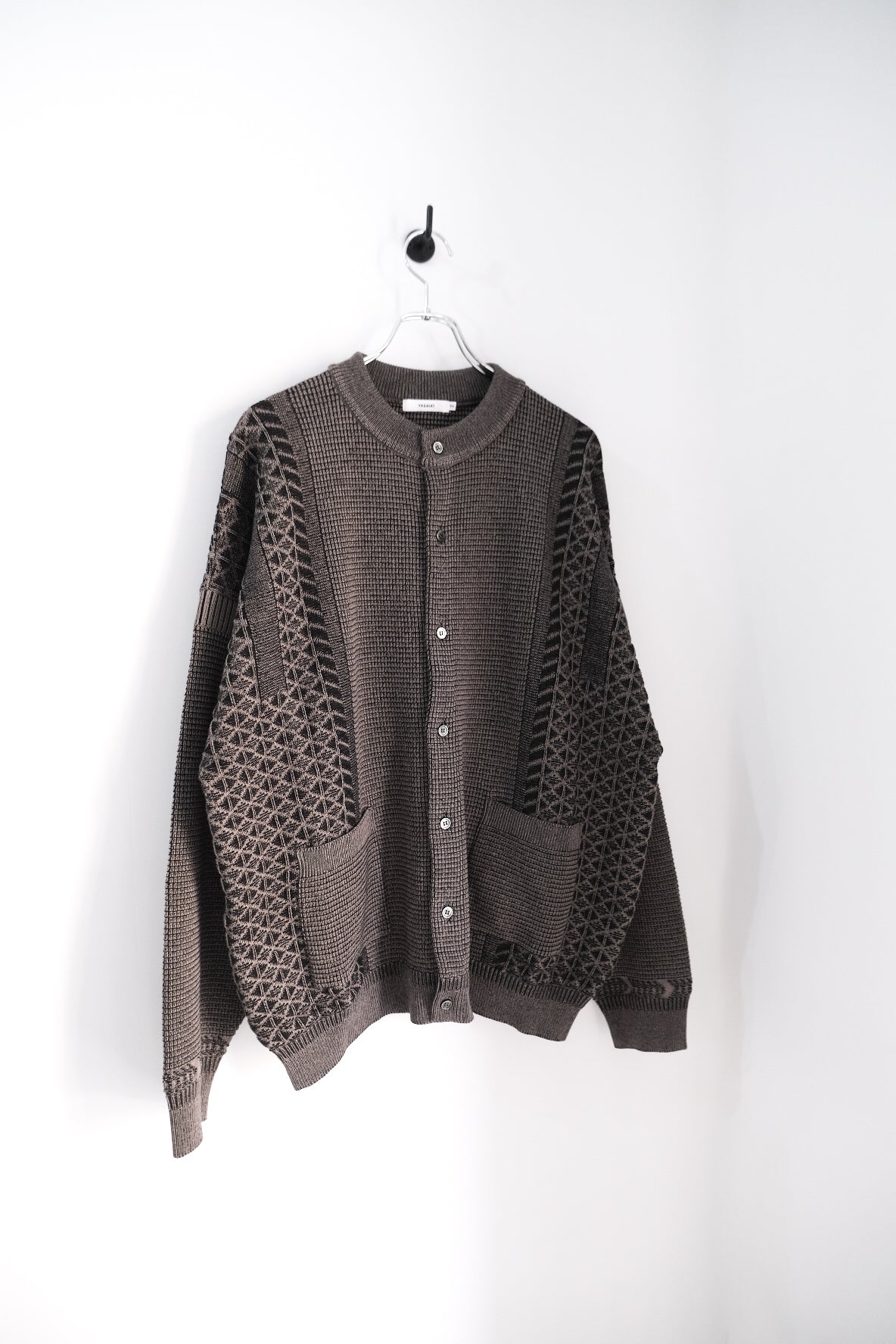 プレーティング編みと言われる表目側と裏目側で異なる糸を編む技法を使用し、表と裏で糸の色を変えて、2色で編むことで奥行きのある表情に仕上げた。