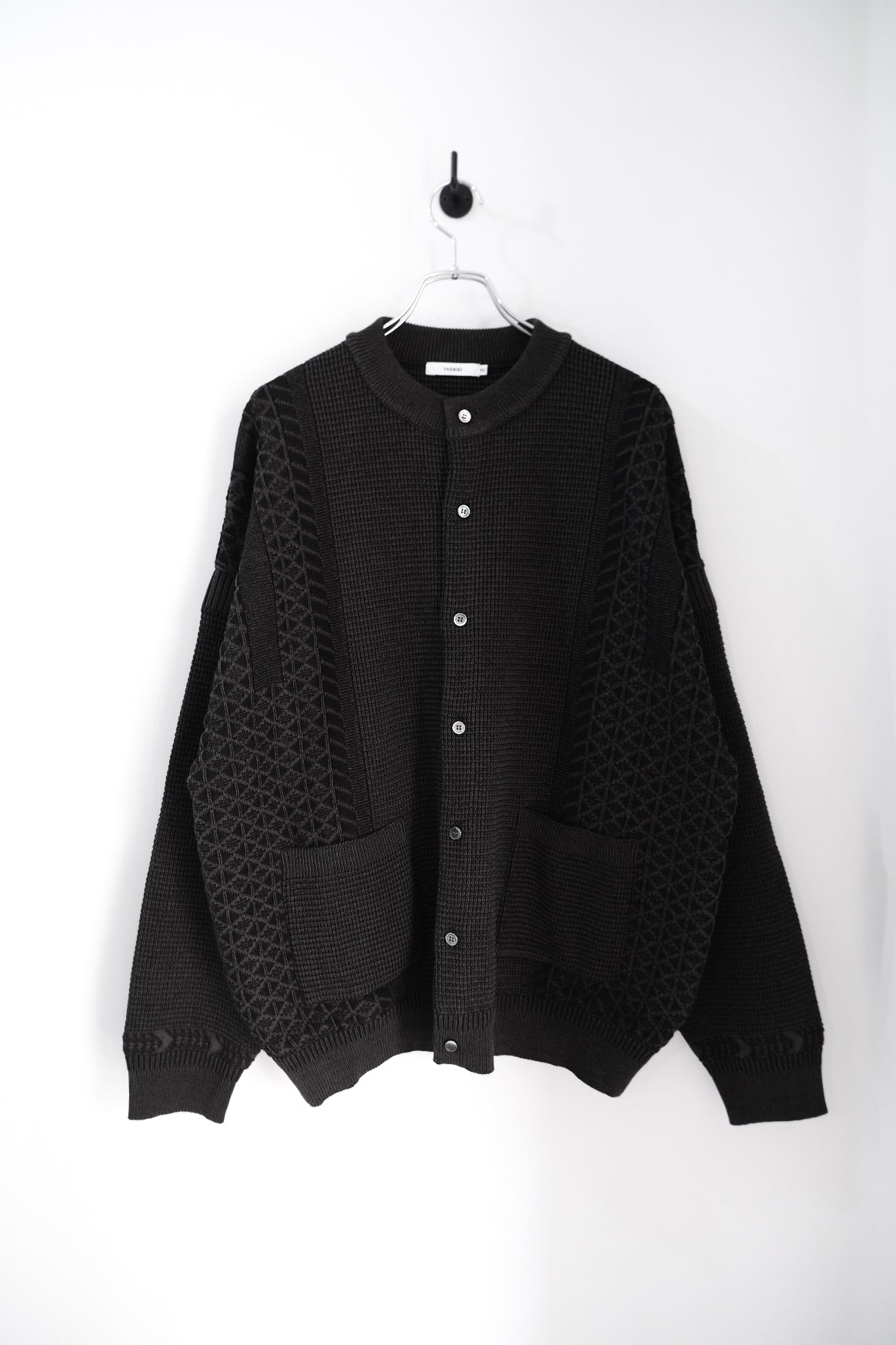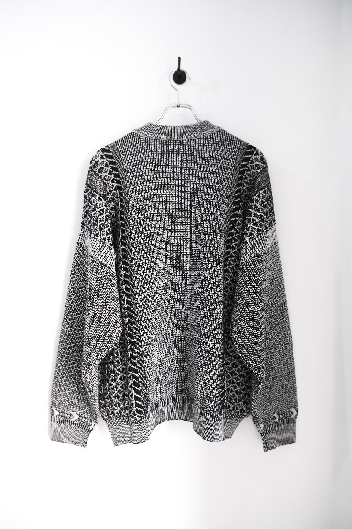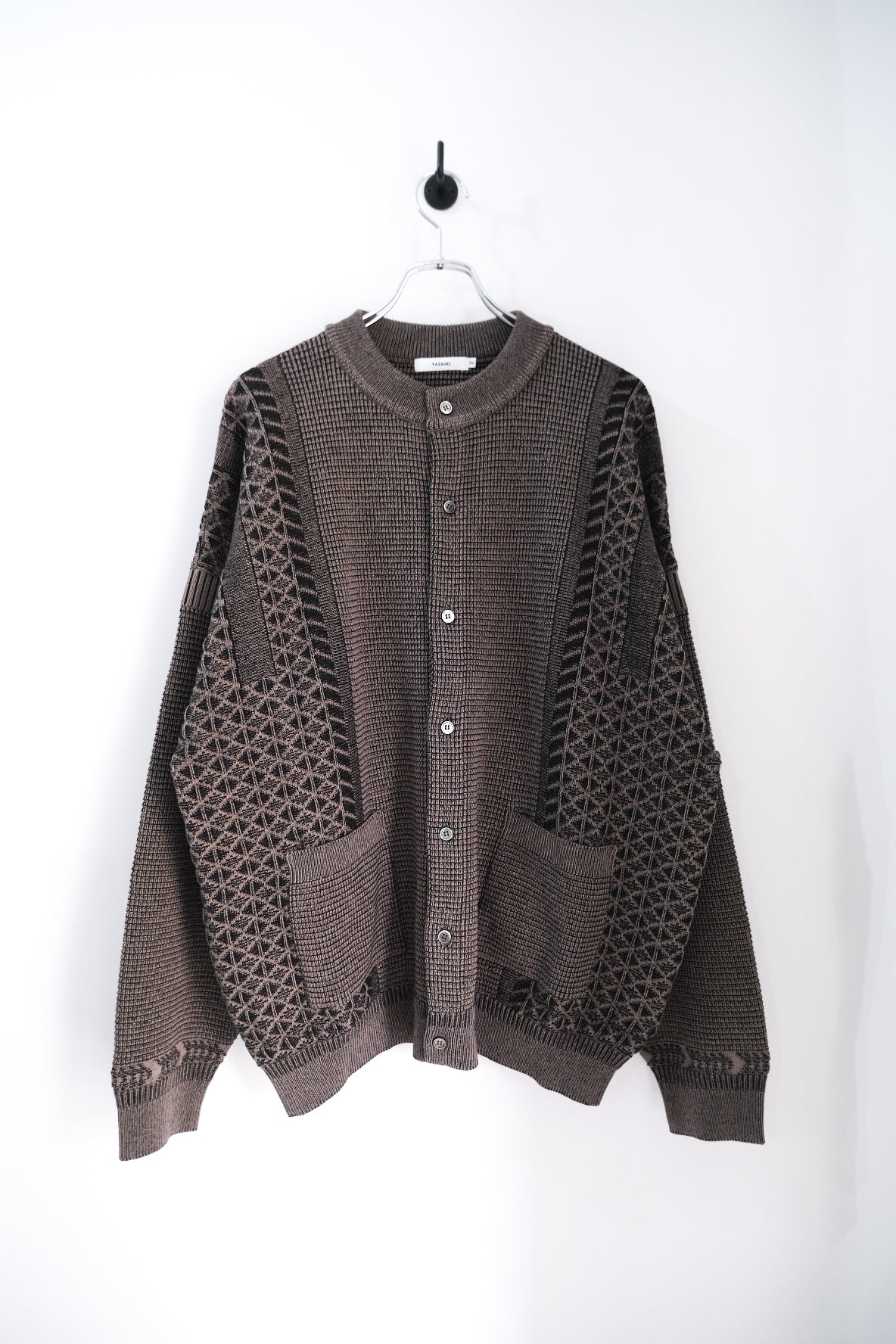プレーティング編みと言われる表目側と裏目側で異なる糸を編む技法を使用し、表と裏で糸の色を変えて、2色で編むことで奥行きのある表情に仕上げた。