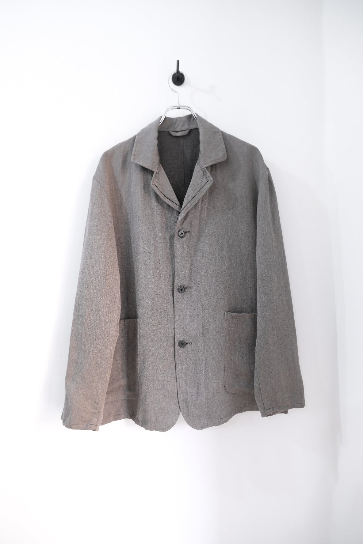 剥ぎ取られたかの様なラペル仕様など、⻑年着込まれたような粗野な雰囲気を加えながら、製品洗いをかけることで表情のある佇まいとカーディンガンのよう軽やかな印象に仕上げている。