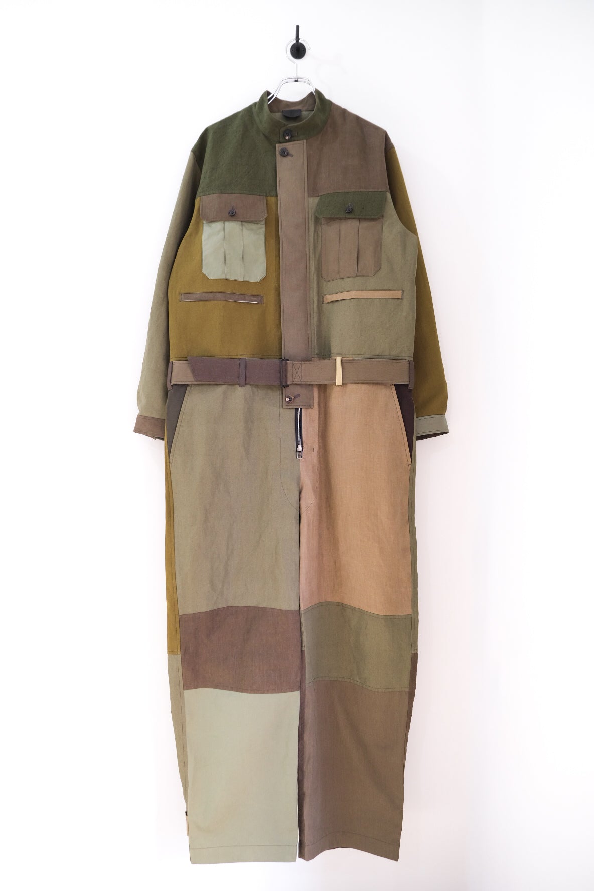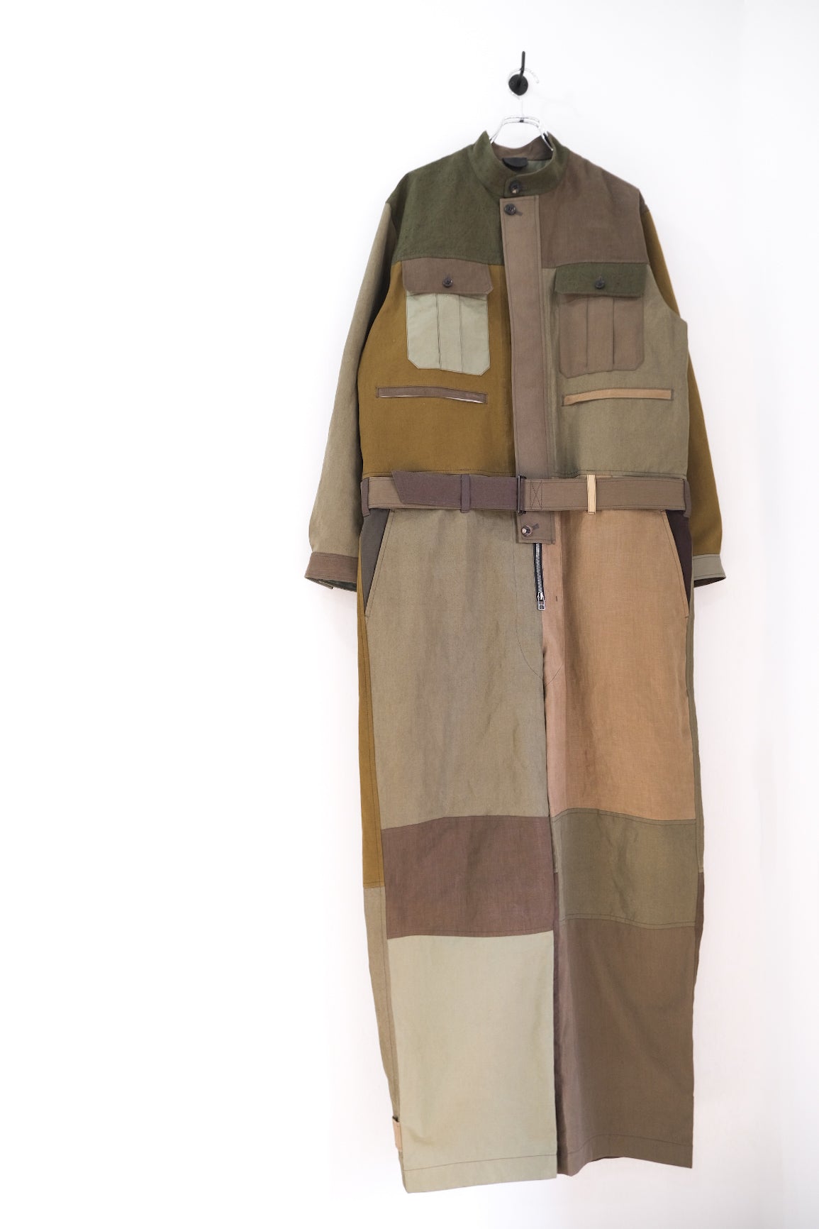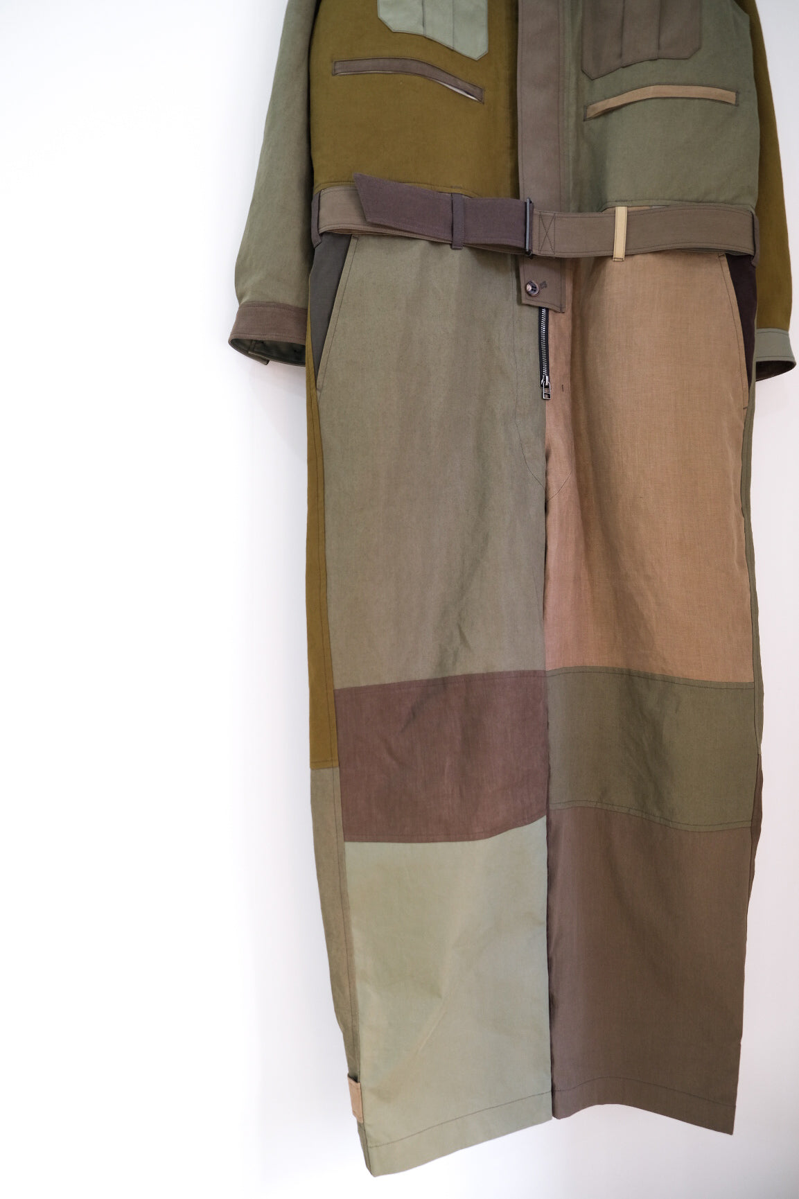 ⼀点⼀点違った表情を⾒せるパッチワークのようなアイテムだが、同じ⾊⽬の⽣地を集め、⼭内らしくカジュアルになりすぎない様意識している。