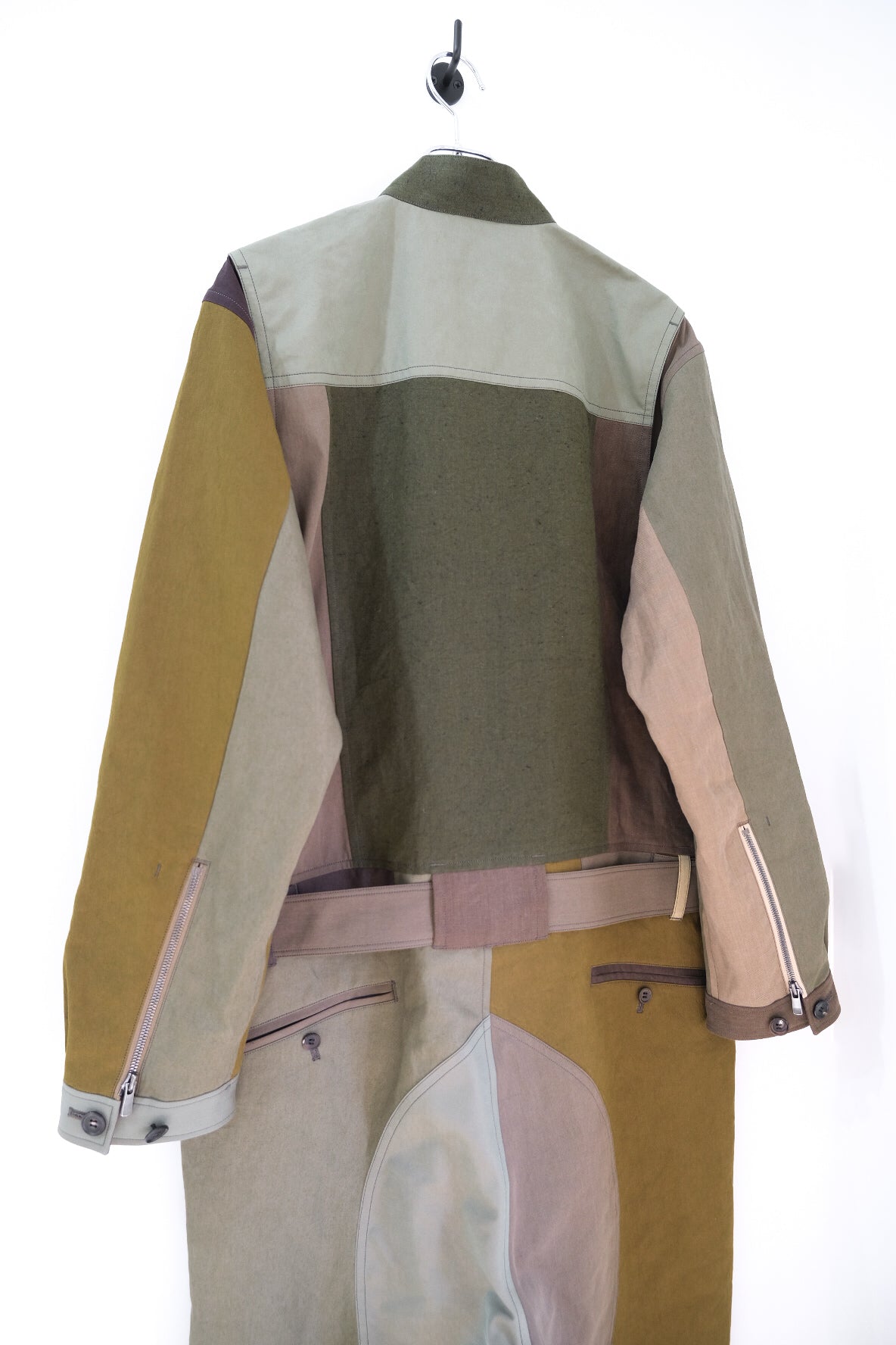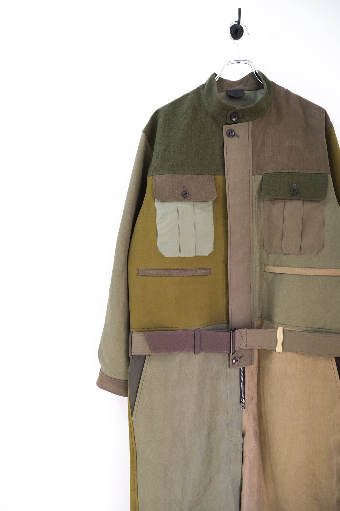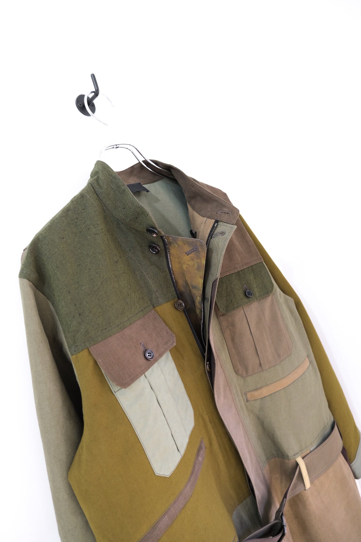 ⼀点⼀点違った表情を⾒せるパッチワークのようなアイテムだが、同じ⾊⽬の⽣地を集め、⼭内らしくカジュアルになりすぎない様意識している。