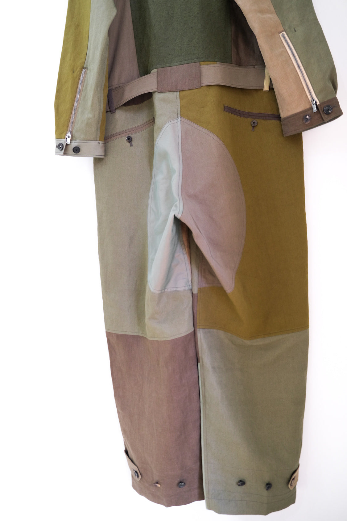 ⽣地の状態で加⼯、染めの⼯程を加え新たなテキスタイルに変化させ、その多種にわたる⽣地を使い、洋服の各パーツにランダムに振り分け裁断し、組み上げていく。